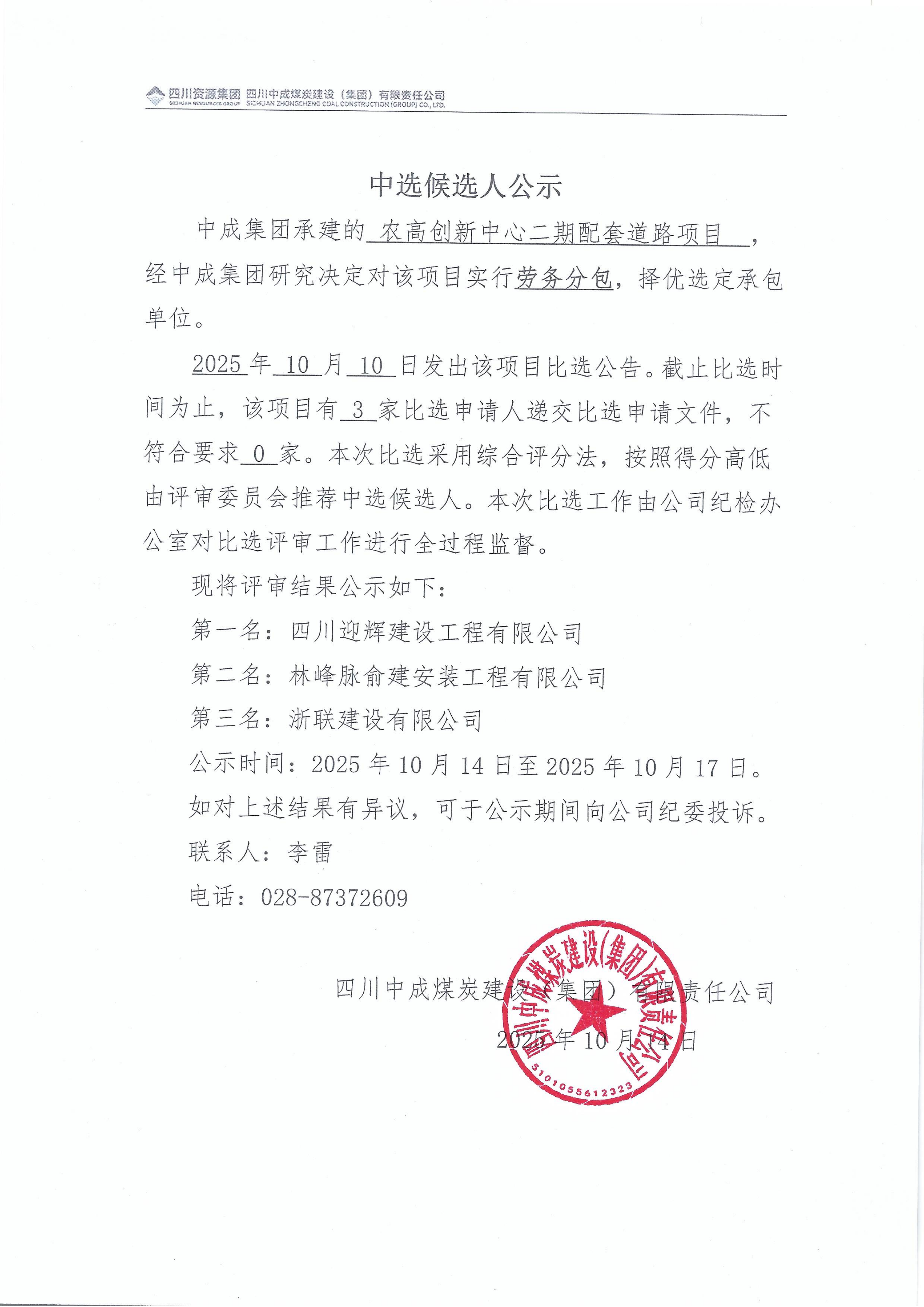 農(nóng)高創(chuàng)新中心二期配套道路項(xiàng)目勞務(wù)分包工程(第二次)中選候選人公示